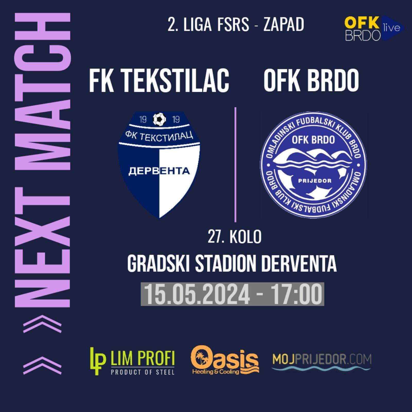 Pred fudbalerima Omladinskog fudbalskog kluba Brdo je duel 27. kola i gostovanje u Derventi. Susret sa ekipom Tekstilca dolazi nakon pobjede u duelu sa Goricom iz Šipova i naravno da…